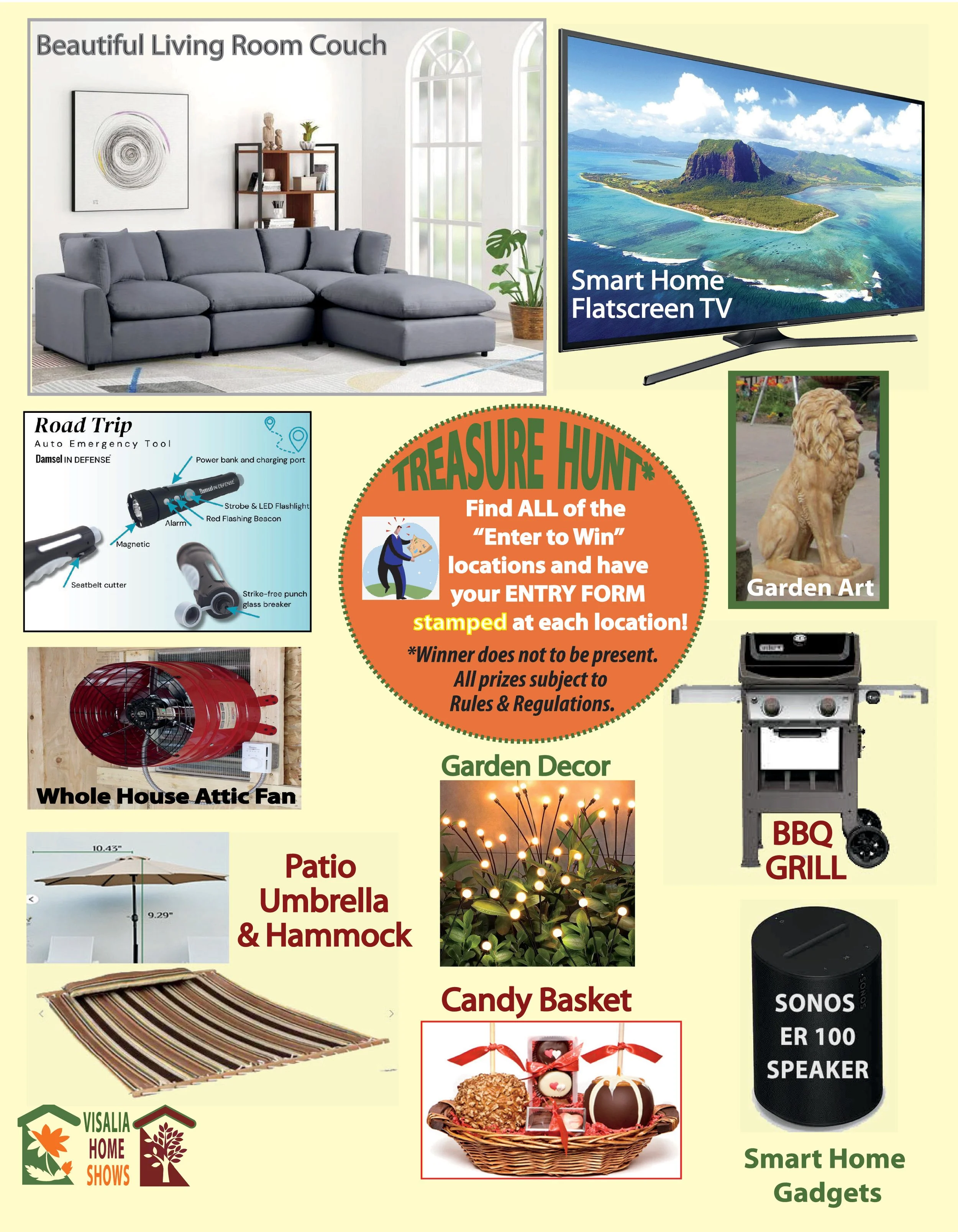 The Annual Treasure Hunt returns to the Visalia Home And Patio Springfest. Go to every “Enter to Win” Red Star booth location, get your form stamped, and you will qualify for a chance to win these great exhibitor giveaways! (Need not be present to win.)